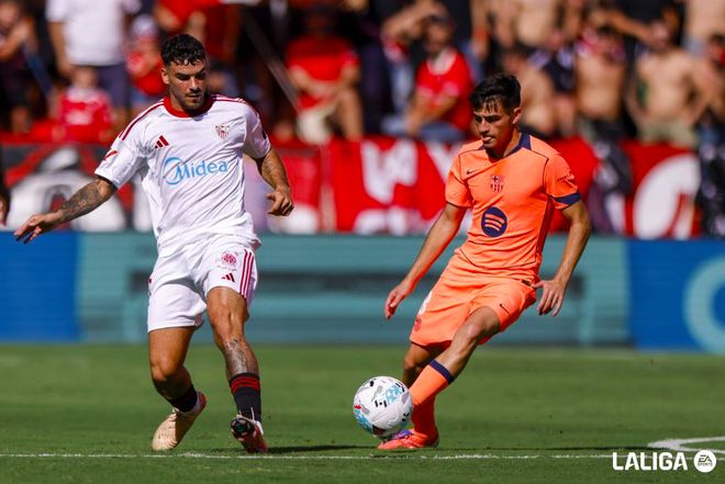 第22分钟,塞维利亚在巴萨半场连续传球,门迪后点的射门稍稍偏出。